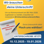Damit Wössen Mitnand zur Kommunalwahl im März 2026 zugelassen werden kann, benötigen wir mindestens 80 Unterstützungsunterschriften von wahlberechtigten Wössnerinnen und Wössnern. Es liegen zwei Unterschriftenlisten von Wössen Mitnand im Einwohnermeldeamt im Rathaus Unterwössen aus, eine für die Kandidaten für den…