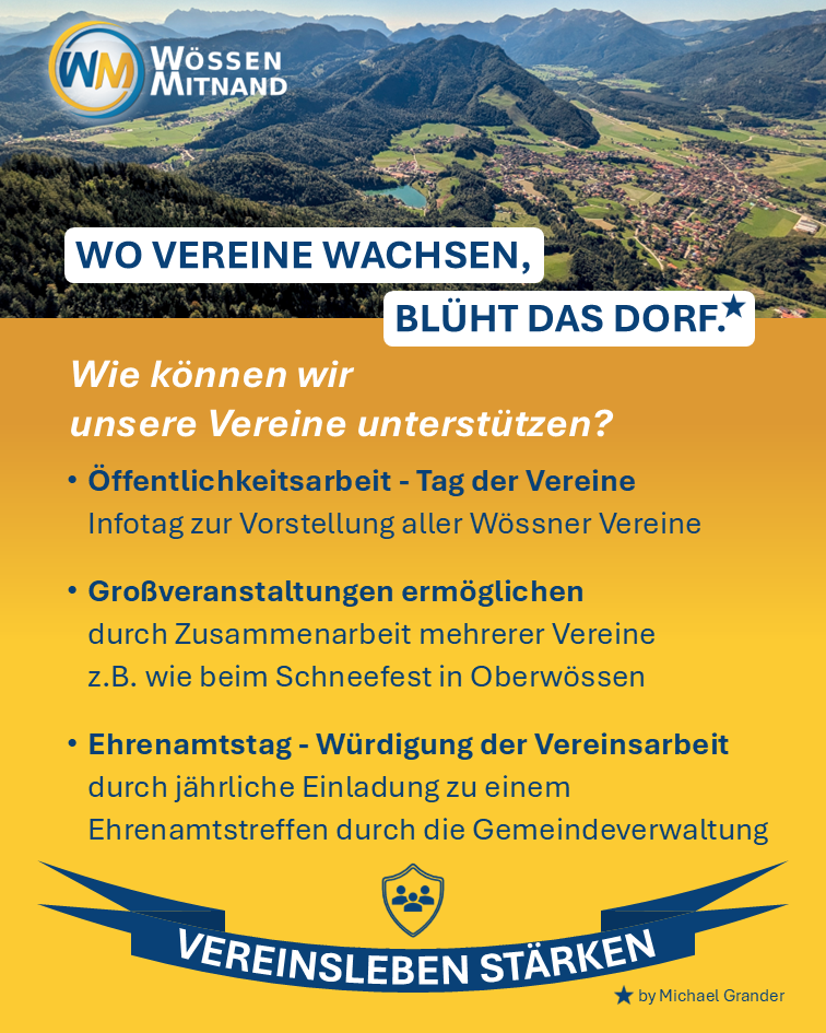 Vereine sind für eine Gemeinde unverzichtbar, da sie das soziale Miteinander und den Gemeinschaftssinn fördern und die Integration von Zugezogenen erleichtern. Daher wollen wir die Vereine stärken und ehrenamtliches Engagement unterstützen, um das Vereinsleben attraktiv zu halten. Denn wo Vereine wachsen, blüht das Dorf.