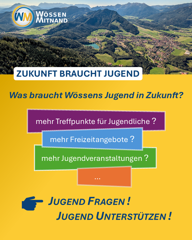 Wir möchten die Jugend stärker fördern und jungen Menschen die Möglichkeit geben, sich bei der Gestaltung der Gemeinde mit einzubringen. Dies könnte zum Beispiel durch mehr Freizeitangebote, mehr Treffpunkte für Jugendliche, Ideenwerkstätten und eine Jugendbürgerversammlung erreicht werden.